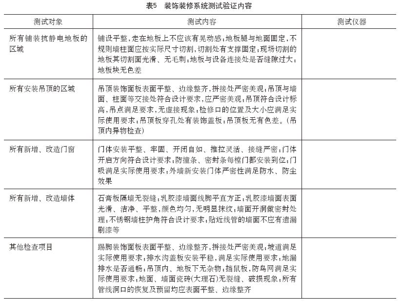 数据中心基础设施为用户的业务需求提供支撑,同时它也是一个建筑主体,需要满足设备、人员对装饰装修方面的相关要求。装饰装修系统的测试验证工作主要是对地板、吊顶、门窗、墙体等是否符合规范的检查。有关装饰装修系统的测试验证主要工作内容见表5。