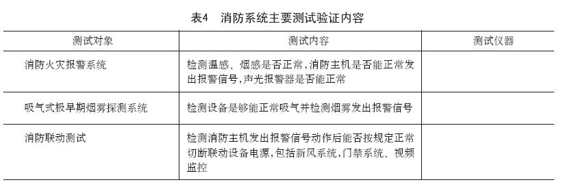 数据中心如果发生火灾,会毁坏计算机设备,中断正常的系统运行,甚至危及工作人员的生命,所以消防系统非常重要。对于消防系统的测试验证工作主要就是检查报警系统、灭火系统、排烟系统是否能够在早期发现火灾隐患,准确及时报警,在火灾发生后快速灭火,并将有害气体排出。有关消防系统的测试验证主要工作内容见表4。
