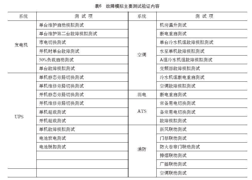 故障模拟测试是借助假负载营造数据中心上线后的实际运行情况,然后模拟机房运行中可能出现的故障,来验证各系统在出现故障情况下的反应是否符合设计预期,从而判断机房的抗故障能力和设计等级。故障模拟测试不但是验证机房实际运行能力的重要手段,也为运维团队提供应对紧急状况的实践经验,运维人员应该在故障模拟测试过程中了解系统的薄弱环节、总结有可能出现的故障特征、制定最佳应对流程,才能在以后的运维工作中遇到故障不慌乱,及时准确地采取措施,将故障对系统运行的影响降到最低。有关故障模拟的测试验证主要工作内容见表6。