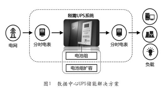 首先,作为储能应用的UPS须先扩容电池组,让全电池组参与储能。电池容量的设计一定要保证60%作为储能来用,剩余的40%作为UPS后备供电,如此才能让电源充分满足用户的刚性用电需求。这套设计方案改造工程量小,系统收益率高,特别适用于数据中心、大型商业体。数据中心UPS储能解决方案如图1所示。