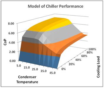 图3曲线的主要特征是当冷凝器温度升高超过30°C时,当冷却负荷接近100%时,能效比急剧下降。在图3中的冷水机组的复杂性是一个单一的子系统组件中集中了各种数据中心的关键组件,这些组件的设备中的功率和热量的分布之间相互作用。例如,制冷机组在冷却负荷时从配电板或面板的电源进行供电,表示机械装置和电气装置之间的相互作用。
