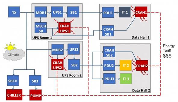 图4 确定电源和冷却链的组合数据中心的性能模型(蓝色连接代表的是电源链,红色连接代表的是冷却链)。