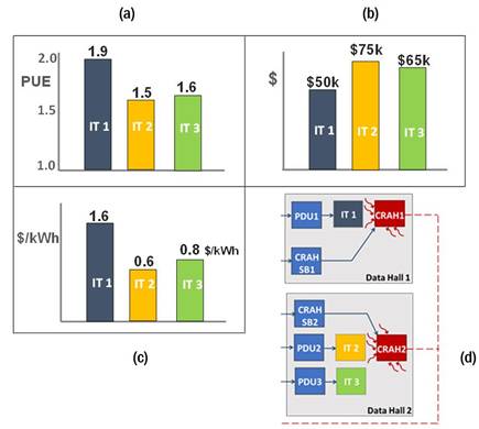 鉴于工程问题可以通过性能模型在图4中得到解决,报告活动的指标成为一件容易的事。这些指标可能包括客户级PUE,总成本和交付成本(美元/千瓦时)的类型,为高级管理层提供商业智能和决策能力。图6显示了在图4中建模的数据中心中每个客户的分配的度量标准。输出来自工程模型,认为能源管理费用,是基于成本的资本和维护成本的指标。考虑图6(a);分配客户IT的PUE(1)比IT(2)和IT(3)要高很多。这一结果是作业绩效模型图4的结果,而由不同系列的UPS和不同类型CRAH单元组成的IT(1),比IT(2)和IT(3)交付成本更高。