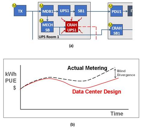 在图5的(a)中所示的例子中,仪表被提名和数据中心的关键性能指标(KPI)跟踪与预期设计性能(参见图5b)。区别在哪里开始,见图(5b)。它只是通过绘制的健康预期的设计从模型读取可见。发散的常见原因是人工干预,其中有人已经改变了设置,冷却系统或系统已经响应产生不利于载荷状况,但只是在一定程度上还尚未成为危险项目。如果早按照图5检测(b)所示,设施人员能及时处理,并试图恢复分歧的差距,并将数据中心带回到设计。