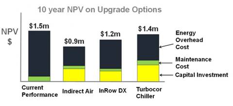 该模型需要从所有的主要数据中心项目的性能和数据的输入,以允许在一个组件和/或系统级的数据中心容量利用率的评估。它有助于数据中心的计划,并为即将到来的基础设施维护和增强计划,它可以帮助评估设施升级选项,而不需要长期的、复杂的、充满错误的电子表格。图8给出了一个10年的净现值(NPV)为冷却系统升级的计算,考虑到对能源的开销,维修成本和所需的资本投资。在这种情况下,它很容易在较短的时间内评估升级选项的内部工程团队,并排除那些不提供一个成本效益的商业案例。在图8的基础上,安装Turbocor制冷机组10年以上将对成本没有什么影响,而采用间接冷却系统可以节约60万美元。
