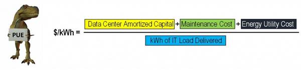 图6(c)根据他们的活动模型,为每一个客户分配美元/千瓦时。“数据中心交付成本”是报告的成本效益真实的方式,可能比PUE对于高级管理层更有意义。例如,在第一个新数据中心的第一个两到三年的寿命中,资本成本分量起支配作用不管PUE和运行效率。