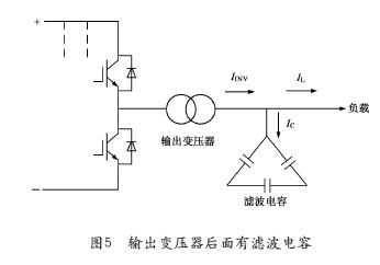 咱们知道变压器后边有滤波电容,它可滤掉高频脉冲,关于50Hz频率来说是一个固定电容支路。也即是说这个电容是并联在输出电压上的,正常时就有一个容性电流流过。它与负载电流一起由逆变器经变压器的电流承当,如图5所示。