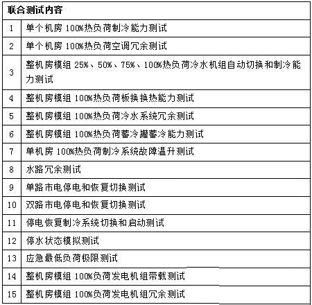 联合测试指数据中心所有机电系统作为一个整体进行测试,通过全额假负载模拟真实运行时的各种运行状态及故障模式时的各种状态。进行全额假负载投入的成本非常大,如无法获得高额预算可减少假负载的数量,但不能少于25%的带载量。