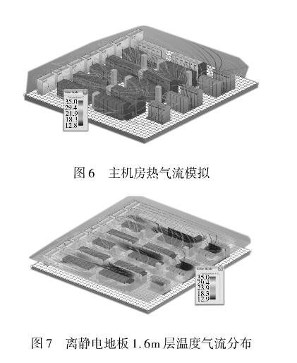经过模拟后,主机房气流组织模拟与温度分布如图4~7所示。