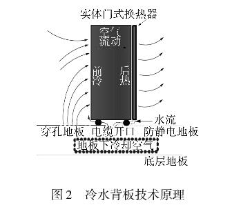 为降低能耗,本工程使用冷水背板技术,一种近距离制冷技术来改善局部空间发热密度过高的问题。该背板安装在机柜门后,不占用机房空间,使用过程中没有功率损耗,也不产生噪声,能够满足密度大的机房冷却需要。该技术原理如图2所示。