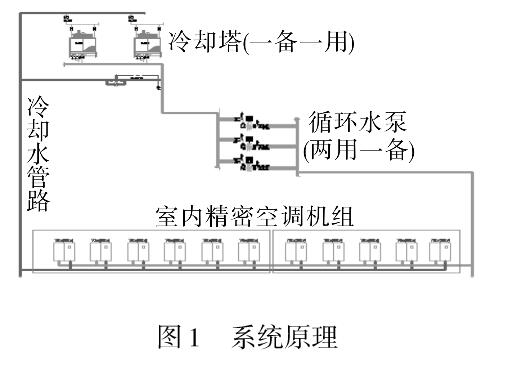 结合现场环境条件,以及在建筑格局、可靠性、安全性、初投资方面的比较,本工程选择水冷直接蒸发式美女黄色在线观看机组的空调方式,主要采用冷媒直接蒸发式蒸发器,冷凝器采用循环水直接冷却方式,系统制冷介质为冷媒(R22)。系统原理如图1所示。由图1可知,系统主要由室内空调机组,冷却水系统(含冷却塔、水泵、管路)构成。冷却塔一用一备,水泵设计为2用1备,冷却水管采用机械循环同程式布置。冷却塔放置楼顶,循环水泵房设置在冷水机房。