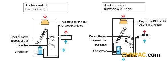 风冷式直接蒸发系统使用冷媒作为传热媒介。机组内的制冷系统由蒸发盘管、压缩机、冷凝器等制冷管路组成,室内空气穿过机组内部风道进行循环。将远端的风冷冷凝器与室内机相连接,整个制冷循环在一个封闭的系统内,从而吸收房间内的热负荷并排放到大气中风冷式机组。