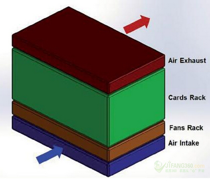 冷却系统的组织,是为了使其符合机架供应商的标准。如图1所示,其显示了美女黄色网站最终的设计草图。进气口是在前端的底部,而空气的排出口是在顶部的背面或顶部。空气流是从机架的底部流到顶部。最小空气流量为每秒0.2立方米(m3/s)或420立方英尺每分钟(cfm)。这一空气流被定义了,以便该系统将能够与现有的卡和机架向后兼容。机架的大小被固定在大约0.4 m x 0.44 m x 0.25 m (H x W x D),这意味着系统中的空气每秒将被替换约四次。