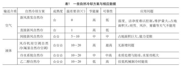 理论上,当室内外温差达到某个值时,自然冷却系统就可以启动运行。但由于系统可靠性、制冷量、工艺要求、实际效果等因素的影响,事实上却不能启动或没有节能经济性,仍要靠机械制冷方式运行。把理论上可以自然冷却,但却由于种种原因不能利用的时间,称为自然冷却的“尴尬时段”。如何缩减自然冷却的“尴尬时段”,成为各种自然冷却方案所要解决的课题。对这些问题的解决或提升,成为自然冷却方案成功与否的关键因素。表1给出了一些自然冷却方案与相应数据,可供参考。